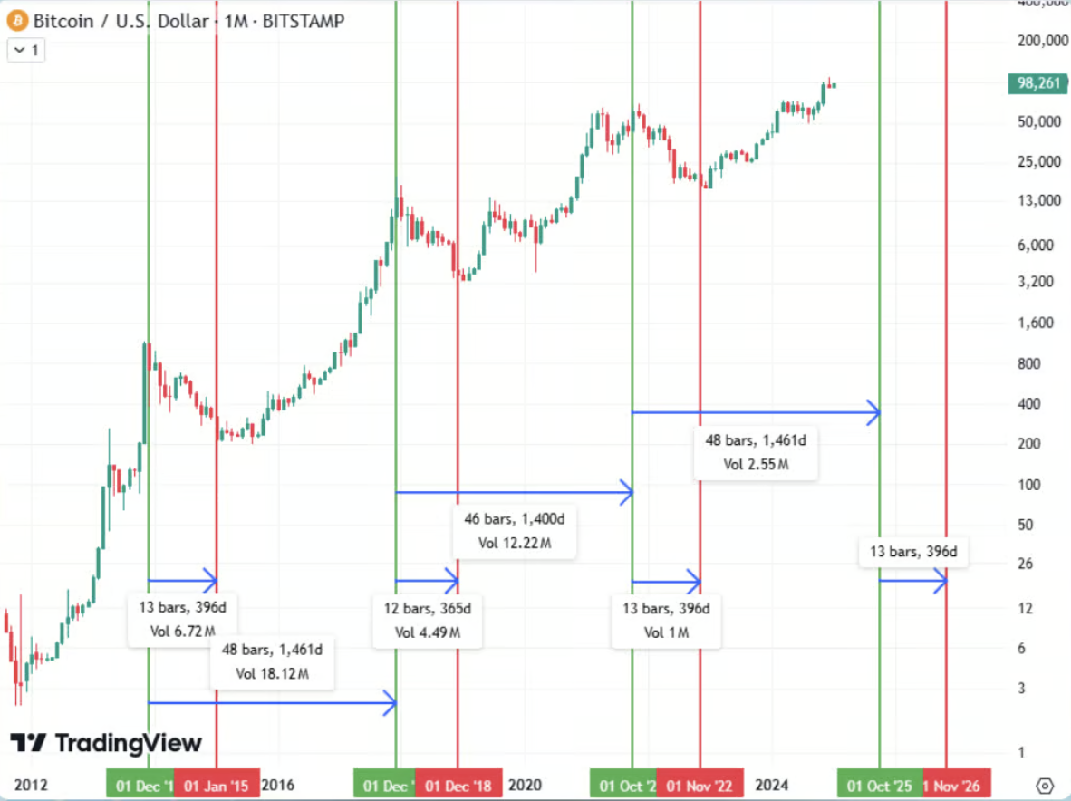 Historicamente, el comportamiento del mercado cripto ha seguido ciclos de cuatro años: tres años de crecimiento continuo seguidos por un año de corrección significativa. Este patrón ha marcado la pauta desde los inicios del mercado, con cada ciclo culminando en nuevos máximos que, pese a las correcciones subsiguientes, establecen un piso más alto que el ciclo anterior.